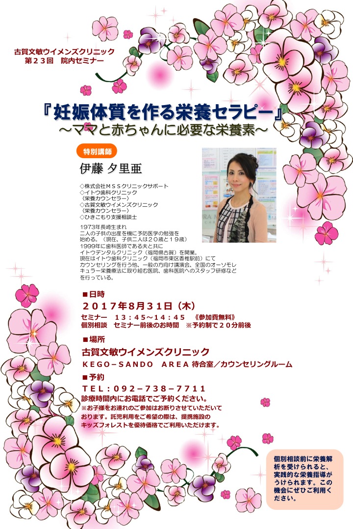 先月初回講演の「妊娠体質を作る栄養セラピー」のセミナーを開催します。